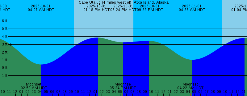 | 2025-10-30 07:10 PM HDT Sunset 2025-10-30 07:45 PM HDT 3.89 feet High Tide 2025-10-31 02:58 AM HDT Moonset 2025-10-31 04:07 AM HDT 0.42 feet Low Tide 2025-10-31 09:31 AM HDT Sunrise 2025-10-31 01:18 PM HDT 3.87 feet High Tide 2025-10-31 05:24 PM HDT 3.27 feet Low Tide 2025-10-31 05:24 PM HDT Moonrise 2025-10-31 07:08 PM HDT Sunset 2025-10-31 09:33 PM HDT 3.45 feet High Tide 2025-11-01 04:22 AM HDT Moonset 2025-11-01 04:36 AM HDT 1.03 feet Low Tide 2025-11-01 09:33 AM HDT Sunrise 2025-11-01 01:04 PM HDT 3.81 feet High Tide 2025-11-01 05:35 PM HDT Moonrise 2025-11-01 06:14 PM HDT 2.51 feet Low Tide 2025-11-01 07:06 PM HDT Sunset 2025-11-01 11:38 PM HDT 3.02 feet High Tide 2025-11-02 03:59 AM HST 1.75 feet Low Tide 2025-11-02 04:47 AM HST Moonset 2025-11-02 08:34 AM HST Sunrise 2025-11-02 11:55 AM HST 3.97 feet High Tide 2025-11-02 04:47 PM HST Moonrise 2025-11-02 06:04 PM HST Sunset 2025-11-02 06:06 PM HST 1.60 feet Low Tide 2025-11-03 01:12 AM HST 2.83 feet High Tide 2025-11-03 04:07 AM HST 2.52 feet Low Tide 2025-11-03 06:16 AM HST Moonset 2025-11-03 08:36 AM HST Sunrise 2025-11-03 11:55 AM HST 4.32 feet High Tide | Other Nearby Tide Stations |