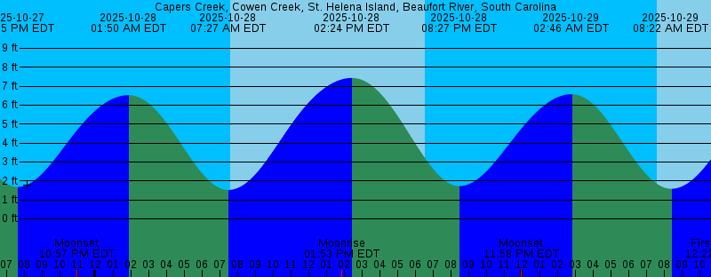 2025-10-27 06:36 PM EDT Sunset 2025-10-27 07:35 PM EDT 1.68 feet Low Tide 2025-10-27 10:57 PM EDT Moonset 2025-10-28 01:50 AM EDT 6.53 feet High Tide 2025-10-28 07:27 AM EDT 1.52 feet Low Tide 2025-10-28 07:36 AM EDT Sunrise 2025-10-28 01:53 PM EDT Moonrise 2025-10-28 02:24 PM EDT 7.43 feet High Tide 2025-10-28 06:35 PM EDT Sunset 2025-10-28 08:27 PM EDT 1.73 feet Low Tide 2025-10-28 11:58 PM EDT Moonset 2025-10-29 02:46 AM EDT 6.57 feet High Tide 2025-10-29 07:37 AM EDT Sunrise 2025-10-29 08:22 AM EDT 1.58 feet Low Tide 2025-10-29 12:22 PM EDT First Quarter 2025-10-29 02:31 PM EDT Moonrise 2025-10-29 03:21 PM EDT 7.48 feet High Tide 2025-10-29 06:34 PM EDT Sunset 2025-10-29 09:25 PM EDT 1.62 feet Low Tide 2025-10-30 01:00 AM EDT Moonset 2025-10-30 03:43 AM EDT 6.80 feet High Tide 2025-10-30 07:38 AM EDT Sunrise 2025-10-30 09:27 AM EDT 1.53 feet Low Tide 2025-10-30 03:05 PM EDT Moonrise 2025-10-30 04:17 PM EDT 7.62 feet High Tide 2025-10-30 06:33 PM EDT Sunset 2025-10-30 10:25 PM EDT 1.33 feet Low Tide 2025-10-31 02:04 AM EDT Moonset 2025-10-31 04:40 AM EDT 7.19 feet High Tide 2025-10-31 07:38 AM EDT Sunrise 2025-10-31 10:35 AM EDT 1.32 feet Low Tide |