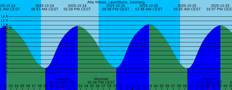 2025-10-24 02:12 AM CEST 11.86 feet High Tide 2025-10-24 08:12 AM CEST Sunrise 2025-10-24 08:53 AM CEST 2.03 feet Low Tide 2025-10-24 11:58 AM CEST Moonrise 2025-10-24 02:29 PM CEST 11.81 feet High Tide 2025-10-24 06:09 PM CEST Sunset 2025-10-24 06:36 PM CEST Moonset 2025-10-24 09:08 PM CEST 2.12 feet Low Tide 2025-10-25 02:48 AM CEST 12.22 feet High Tide 2025-10-25 08:14 AM CEST Sunrise 2025-10-25 09:25 AM CEST 1.94 feet Low Tide 2025-10-25 01:09 PM CEST Moonrise 2025-10-25 03:07 PM CEST 11.93 feet High Tide 2025-10-25 06:07 PM CEST Sunset 2025-10-25 07:08 PM CEST Moonset 2025-10-25 09:39 PM CEST 2.44 feet Low Tide 2025-10-26 02:27 AM CET 12.22 feet High Tide 2025-10-26 07:16 AM CET Sunrise 2025-10-26 08:58 AM CET 2.46 feet Low Tide 2025-10-26 01:08 PM CET Moonrise 2025-10-26 02:44 PM CET 11.72 feet High Tide 2025-10-26 05:05 PM CET Sunset 2025-10-26 06:56 PM CET Moonset 2025-10-26 09:10 PM CET 3.30 feet Low Tide 2025-10-27 03:02 AM CET 11.94 feet High Tide 2025-10-27 07:18 AM CET Sunrise 2025-10-27 09:30 AM CET 3.37 feet Low Tide 2025-10-27 01:53 PM CET Moonrise 2025-10-27 03:18 PM CET 11.27 feet High Tide 2025-10-27 05:03 PM CET Sunset 2025-10-27 07:59 PM CET Moonset |