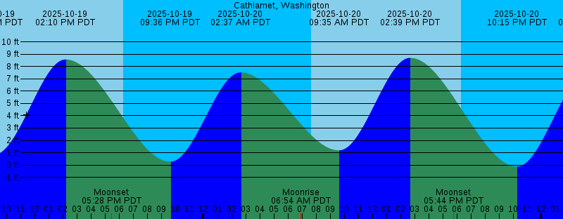 Note: Heights for this station should be disregarded--use times only. 2025-10-19 09:01 AM PDT 0.82 feet Low Tide 2025-10-19 02:10 PM PDT 8.56 feet High Tide 2025-10-19 05:28 PM PDT Moonset 2025-10-19 06:19 PM PDT Sunset 2025-10-19 09:36 PM PDT 0.28 feet Low Tide 2025-10-20 02:37 AM PDT 7.52 feet High Tide 2025-10-20 06:54 AM PDT Moonrise 2025-10-20 07:38 AM PDT Sunrise 2025-10-20 09:35 AM PDT 1.20 feet Low Tide 2025-10-20 02:39 PM PDT 8.69 feet High Tide 2025-10-20 05:44 PM PDT Moonset 2025-10-20 06:17 PM PDT Sunset 2025-10-20 10:15 PM PDT -0.12 feet Low Tide 2025-10-21 03:19 AM PDT 7.46 feet High Tide 2025-10-21 05:25 AM PDT New Moon 2025-10-21 07:39 AM PDT Sunrise 2025-10-21 08:00 AM PDT Moonrise 2025-10-21 10:07 AM PDT 1.64 feet Low Tide 2025-10-21 03:05 PM PDT 8.72 feet High Tide 2025-10-21 06:01 PM PDT Moonset 2025-10-21 06:15 PM PDT Sunset 2025-10-21 10:51 PM PDT -0.35 feet Low Tide 2025-10-22 04:01 AM PDT 7.34 feet High Tide 2025-10-22 07:41 AM PDT Sunrise 2025-10-22 09:08 AM PDT Moonrise 2025-10-22 10:38 AM PDT 2.11 feet Low Tide 2025-10-22 03:29 PM PDT 8.69 feet High Tide 2025-10-22 06:14 PM PDT Sunset 2025-10-22 06:23 PM PDT Moonset 2025-10-22 11:25 PM PDT -0.43 feet Low Tide 2025-10-23 04:42 AM PDT 7.16 feet High Tide 2025-10-23 07:42 AM PDT Sunrise |