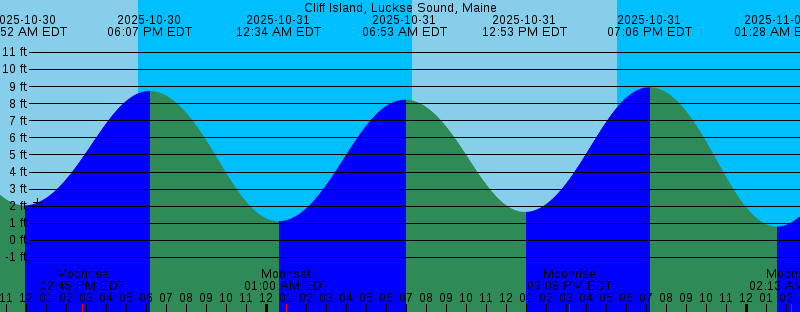 2025-10-30 11:52 AM EDT 2.05 feet Low Tide 2025-10-30 02:45 PM EDT Moonrise 2025-10-30 05:33 PM EDT Sunset 2025-10-30 06:07 PM EDT 8.74 feet High Tide 2025-10-31 12:34 AM EDT 1.12 feet Low Tide 2025-10-31 01:00 AM EDT Moonset 2025-10-31 06:53 AM EDT 8.23 feet High Tide 2025-10-31 07:15 AM EDT Sunrise 2025-10-31 12:53 PM EDT 1.67 feet Low Tide 2025-10-31 03:08 PM EDT Moonrise 2025-10-31 05:32 PM EDT Sunset 2025-10-31 07:06 PM EDT 8.96 feet High Tide 2025-11-01 01:28 AM EDT 0.81 feet Low Tide 2025-11-01 02:13 AM EDT Moonset 2025-11-01 07:16 AM EDT Sunrise 2025-11-01 07:46 AM EDT 8.81 feet High Tide 2025-11-01 01:52 PM EDT 1.07 feet Low Tide 2025-11-01 03:29 PM EDT Moonrise 2025-11-01 05:30 PM EDT Sunset 2025-11-01 08:04 PM EDT 9.29 feet High Tide 2025-11-02 01:20 AM EST 0.41 feet Low Tide 2025-11-02 02:28 AM EST Moonset 2025-11-02 06:18 AM EST Sunrise 2025-11-02 07:37 AM EST 9.51 feet High Tide 2025-11-02 01:48 PM EST 0.34 feet Low Tide 2025-11-02 02:50 PM EST Moonrise 2025-11-02 04:29 PM EST Sunset 2025-11-02 08:00 PM EST 9.67 feet High Tide 2025-11-03 02:10 AM EST 0.01 feet Low Tide 2025-11-03 03:45 AM EST Moonset 2025-11-03 06:19 AM EST Sunrise 2025-11-03 08:25 AM EST 10.26 feet High Tide |