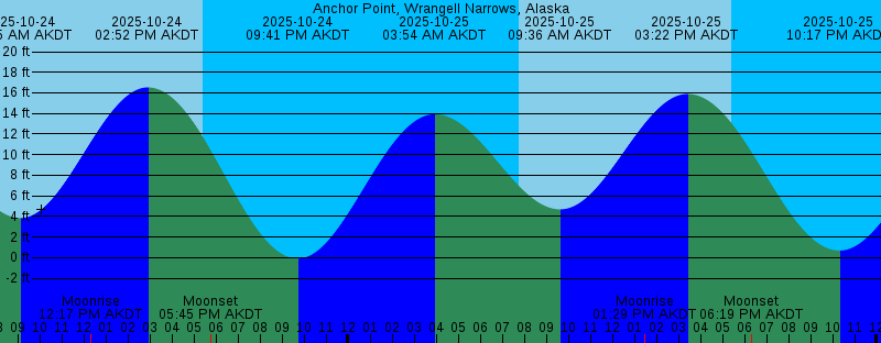2025-10-24 03:18 AM AKDT 14.64 feet High Tide 2025-10-24 07:44 AM AKDT Sunrise 2025-10-24 09:05 AM AKDT 3.84 feet Low Tide 2025-10-24 12:17 PM AKDT Moonrise 2025-10-24 02:52 PM AKDT 16.53 feet High Tide 2025-10-24 05:26 PM AKDT Sunset 2025-10-24 05:45 PM AKDT Moonset 2025-10-24 09:41 PM AKDT -0.09 feet Low Tide 2025-10-25 03:54 AM AKDT 13.93 feet High Tide 2025-10-25 07:46 AM AKDT Sunrise 2025-10-25 09:36 AM AKDT 4.69 feet Low Tide 2025-10-25 01:29 PM AKDT Moonrise 2025-10-25 03:22 PM AKDT 15.89 feet High Tide 2025-10-25 05:23 PM AKDT Sunset 2025-10-25 06:19 PM AKDT Moonset 2025-10-25 10:17 PM AKDT 0.68 feet Low Tide 2025-10-26 04:34 AM AKDT 13.08 feet High Tide 2025-10-26 07:48 AM AKDT Sunrise 2025-10-26 10:09 AM AKDT 5.55 feet Low Tide 2025-10-26 02:23 PM AKDT Moonrise 2025-10-26 03:56 PM AKDT 15.09 feet High Tide 2025-10-26 05:21 PM AKDT Sunset 2025-10-26 07:12 PM AKDT Moonset 2025-10-26 10:58 PM AKDT 1.56 feet Low Tide 2025-10-27 05:22 AM AKDT 12.23 feet High Tide 2025-10-27 07:51 AM AKDT Sunrise 2025-10-27 10:50 AM AKDT 6.38 feet Low Tide 2025-10-27 02:58 PM AKDT Moonrise 2025-10-27 04:38 PM AKDT 14.18 feet High Tide 2025-10-27 05:19 PM AKDT Sunset 2025-10-27 08:25 PM AKDT Moonset |