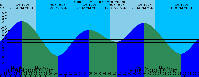 2025-10-25 04:02 AM AKDT 9.92 feet High Tide 2025-10-25 08:52 AM AKDT Sunrise 2025-10-25 09:40 AM AKDT 4.53 feet Low Tide 2025-10-25 03:13 PM AKDT 12.20 feet High Tide 2025-10-25 03:43 PM AKDT Moonrise 2025-10-25 05:53 PM AKDT Moonset 2025-10-25 06:02 PM AKDT Sunset 2025-10-25 10:26 PM AKDT 0.52 feet Low Tide 2025-10-26 04:42 AM AKDT 9.24 feet High Tide 2025-10-26 08:55 AM AKDT Sunrise 2025-10-26 10:16 AM AKDT 5.22 feet Low Tide 2025-10-26 03:43 PM AKDT 11.61 feet High Tide 2025-10-26 04:36 PM AKDT Moonrise 2025-10-26 06:00 PM AKDT Sunset 2025-10-26 06:48 PM AKDT Moonset 2025-10-26 11:10 PM AKDT 1.18 feet Low Tide 2025-10-27 05:35 AM AKDT 8.56 feet High Tide 2025-10-27 08:57 AM AKDT Sunrise 2025-10-27 10:59 AM AKDT 5.85 feet Low Tide 2025-10-27 04:18 PM AKDT 10.86 feet High Tide 2025-10-27 04:51 PM AKDT Moonrise 2025-10-27 05:57 PM AKDT Sunset 2025-10-27 08:22 PM AKDT Moonset 2025-10-28 12:00 AM AKDT 1.80 feet Low Tide 2025-10-28 06:56 AM AKDT 8.14 feet High Tide 2025-10-28 09:00 AM AKDT Sunrise 2025-10-28 11:54 AM AKDT 6.32 feet Low Tide 2025-10-28 04:54 PM AKDT Moonrise 2025-10-28 05:09 PM AKDT 9.98 feet High Tide 2025-10-28 05:54 PM AKDT Sunset 2025-10-28 10:05 PM AKDT Moonset 2025-10-29 12:57 AM AKDT 2.25 feet Low Tide |