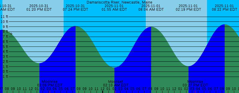 | 2025-10-31 07:11 AM EDT 8.39 feet High Tide 2025-10-31 07:13 AM EDT Sunrise 2025-10-31 01:20 PM EDT 1.70 feet Low Tide 2025-10-31 03:06 PM EDT Moonrise 2025-10-31 05:29 PM EDT Sunset 2025-10-31 07:24 PM EDT 9.14 feet High Tide 2025-11-01 01:55 AM EDT 0.82 feet Low Tide 2025-11-01 02:10 AM EDT Moonset 2025-11-01 07:15 AM EDT Sunrise 2025-11-01 08:04 AM EDT 8.98 feet High Tide 2025-11-01 02:19 PM EDT 1.09 feet Low Tide 2025-11-01 03:27 PM EDT Moonrise 2025-11-01 05:27 PM EDT Sunset 2025-11-01 08:22 PM EDT 9.48 feet High Tide 2025-11-02 01:47 AM EST 0.42 feet Low Tide 2025-11-02 02:25 AM EST Moonset 2025-11-02 06:16 AM EST Sunrise 2025-11-02 07:55 AM EST 9.70 feet High Tide 2025-11-02 02:15 PM EST 0.34 feet Low Tide 2025-11-02 02:48 PM EST Moonrise 2025-11-02 04:26 PM EST Sunset 2025-11-02 08:18 PM EST 9.86 feet High Tide 2025-11-03 02:37 AM EST 0.01 feet Low Tide 2025-11-03 03:43 AM EST Moonset 2025-11-03 06:17 AM EST Sunrise 2025-11-03 08:43 AM EST 10.47 feet High Tide 2025-11-03 03:08 PM EST -0.44 feet Low Tide 2025-11-03 03:09 PM EST Moonrise 2025-11-03 04:25 PM EST Sunset 2025-11-03 09:11 PM EST 10.21 feet High Tide | Other Nearby Tide Stations |