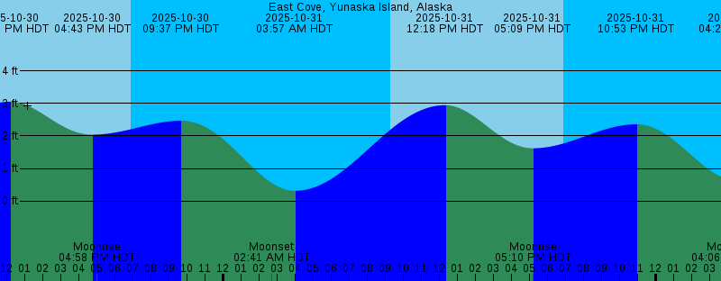 Note: Reference is in time zone :America/Nome; adjusted offsets 1 hr to undo LST compensation. 2025-10-30 09:16 AM HDT Sunrise 2025-10-30 12:10 PM HDT 3.06 feet High Tide 2025-10-30 04:43 PM HDT 2.04 feet Low Tide 2025-10-30 04:58 PM HDT Moonrise 2025-10-30 06:54 PM HDT Sunset 2025-10-30 09:37 PM HDT 2.47 feet High Tide 2025-10-31 02:41 AM HDT Moonset 2025-10-31 03:57 AM HDT 0.31 feet Low Tide 2025-10-31 09:18 AM HDT Sunrise 2025-10-31 12:18 PM HDT 2.95 feet High Tide 2025-10-31 05:09 PM HDT 1.62 feet Low Tide 2025-10-31 05:10 PM HDT Moonrise 2025-10-31 06:52 PM HDT Sunset 2025-10-31 10:53 PM HDT 2.36 feet High Tide 2025-11-01 04:06 AM HDT Moonset 2025-11-01 04:28 AM HDT 0.63 feet Low Tide 2025-11-01 09:20 AM HDT Sunrise 2025-11-01 12:23 PM HDT 2.94 feet High Tide 2025-11-01 05:21 PM HDT Moonrise 2025-11-01 05:45 PM HDT 1.10 feet Low Tide 2025-11-01 06:50 PM HDT Sunset 2025-11-02 12:18 AM HDT 2.28 feet High Tide 2025-11-02 04:01 AM HST 1.05 feet Low Tide 2025-11-02 04:32 AM HST Moonset 2025-11-02 08:21 AM HST Sunrise 2025-11-02 11:33 AM HST 3.04 feet High Tide 2025-11-02 04:32 PM HST Moonrise 2025-11-02 05:29 PM HST 0.53 feet Low Tide 2025-11-02 05:48 PM HST Sunset 2025-11-03 12:50 AM HST 2.31 feet High Tide 2025-11-03 04:37 AM HST 1.53 feet Low Tide 2025-11-03 06:02 AM HST Moonset |