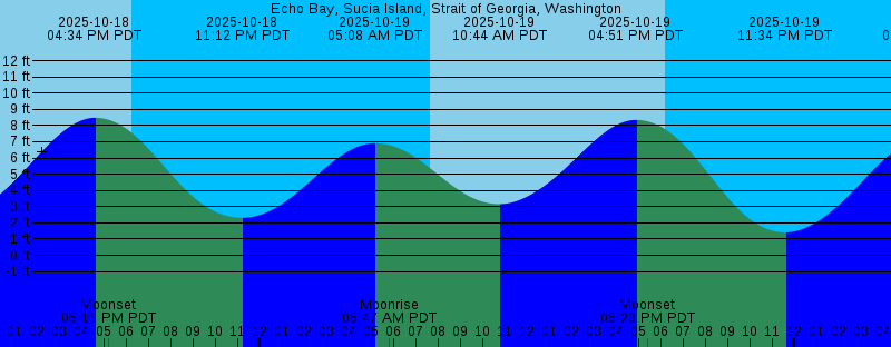 2025-10-18 07:37 AM PDT Sunrise 2025-10-18 10:02 AM PDT 2.33 feet Low Tide 2025-10-18 04:34 PM PDT 8.48 feet High Tide 2025-10-18 05:11 PM PDT Moonset 2025-10-18 06:15 PM PDT Sunset 2025-10-18 11:12 PM PDT 2.32 feet Low Tide 2025-10-19 05:08 AM PDT 6.91 feet High Tide 2025-10-19 05:47 AM PDT Moonrise 2025-10-19 07:38 AM PDT Sunrise 2025-10-19 10:44 AM PDT 3.16 feet Low Tide 2025-10-19 04:51 PM PDT 8.34 feet High Tide 2025-10-19 05:23 PM PDT Moonset 2025-10-19 06:13 PM PDT Sunset 2025-10-19 11:34 PM PDT 1.41 feet Low Tide 2025-10-20 06:03 AM PDT 7.35 feet High Tide 2025-10-20 06:56 AM PDT Moonrise 2025-10-20 07:40 AM PDT Sunrise 2025-10-20 11:23 AM PDT 4.03 feet Low Tide 2025-10-20 05:04 PM PDT 8.24 feet High Tide 2025-10-20 05:37 PM PDT Moonset 2025-10-20 06:11 PM PDT Sunset 2025-10-20 11:58 PM PDT 0.61 feet Low Tide 2025-10-21 05:25 AM PDT New Moon 2025-10-21 06:53 AM PDT 7.78 feet High Tide 2025-10-21 07:41 AM PDT Sunrise 2025-10-21 08:05 AM PDT Moonrise 2025-10-21 12:01 PM PDT 4.87 feet Low Tide 2025-10-21 05:17 PM PDT 8.16 feet High Tide 2025-10-21 05:52 PM PDT Moonset 2025-10-21 06:09 PM PDT Sunset 2025-10-22 12:24 AM PDT -0.06 feet Low Tide |