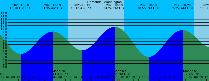 2025-10-18 04:05 PM PDT 10.73 feet High Tide 2025-10-18 05:09 PM PDT Moonset 2025-10-18 06:14 PM PDT Sunset 2025-10-18 10:28 PM PDT 2.05 feet Low Tide 2025-10-19 04:35 AM PDT 9.14 feet High Tide 2025-10-19 05:44 AM PDT Moonrise 2025-10-19 07:35 AM PDT Sunrise 2025-10-19 10:10 AM PDT 3.19 feet Low Tide 2025-10-19 04:24 PM PDT 10.63 feet High Tide 2025-10-19 05:22 PM PDT Moonset 2025-10-19 06:12 PM PDT Sunset 2025-10-19 10:55 PM PDT 1.12 feet Low Tide 2025-10-20 05:24 AM PDT 9.59 feet High Tide 2025-10-20 06:52 AM PDT Moonrise 2025-10-20 07:36 AM PDT Sunrise 2025-10-20 10:51 AM PDT 4.11 feet Low Tide 2025-10-20 04:42 PM PDT 10.50 feet High Tide 2025-10-20 05:37 PM PDT Moonset 2025-10-20 06:11 PM PDT Sunset 2025-10-20 11:20 PM PDT 0.33 feet Low Tide 2025-10-21 05:25 AM PDT New Moon 2025-10-21 06:07 AM PDT 9.99 feet High Tide 2025-10-21 07:38 AM PDT Sunrise 2025-10-21 08:00 AM PDT Moonrise 2025-10-21 11:29 AM PDT 5.04 feet Low Tide 2025-10-21 05:02 PM PDT 10.32 feet High Tide 2025-10-21 05:53 PM PDT Moonset 2025-10-21 06:09 PM PDT Sunset 2025-10-21 11:46 PM PDT -0.30 feet Low Tide 2025-10-22 06:47 AM PDT 10.33 feet High Tide 2025-10-22 07:39 AM PDT Sunrise 2025-10-22 09:09 AM PDT Moonrise 2025-10-22 12:08 PM PDT 5.91 feet Low Tide |
