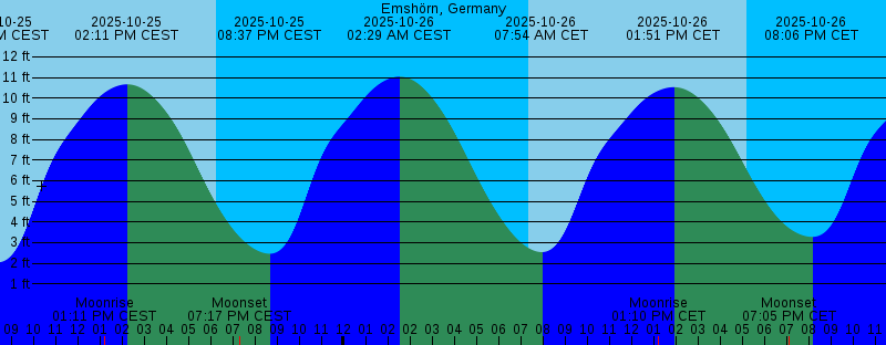 2025-10-24 01:30 PM CEST 10.60 feet High Tide 2025-10-24 06:15 PM CEST Sunset 2025-10-24 06:44 PM CEST Moonset 2025-10-24 08:05 PM CEST 2.04 feet Low Tide 2025-10-25 01:48 AM CEST 10.92 feet High Tide 2025-10-25 08:18 AM CEST Sunrise 2025-10-25 08:20 AM CEST 2.04 feet Low Tide 2025-10-25 01:11 PM CEST Moonrise 2025-10-25 02:11 PM CEST 10.67 feet High Tide 2025-10-25 06:13 PM CEST Sunset 2025-10-25 07:17 PM CEST Moonset 2025-10-25 08:37 PM CEST 2.46 feet Low Tide 2025-10-26 02:29 AM CEST 11.04 feet High Tide 2025-10-26 07:20 AM CET Sunrise 2025-10-26 07:54 AM CET 2.54 feet Low Tide 2025-10-26 01:10 PM CET Moonrise 2025-10-26 01:51 PM CET 10.53 feet High Tide 2025-10-26 05:11 PM CET Sunset 2025-10-26 07:05 PM CET Moonset 2025-10-26 08:06 PM CET 3.28 feet Low Tide 2025-10-27 02:06 AM CET 10.95 feet High Tide 2025-10-27 07:22 AM CET Sunrise 2025-10-27 08:27 AM CET 3.32 feet Low Tide 2025-10-27 01:55 PM CET Moonrise 2025-10-27 02:27 PM CET 10.22 feet High Tide 2025-10-27 05:09 PM CET Sunset 2025-10-27 08:07 PM CET Moonset 2025-10-27 08:28 PM CET 4.13 feet Low Tide 2025-10-28 02:36 AM CET 10.82 feet High Tide 2025-10-28 07:24 AM CET Sunrise 2025-10-28 08:59 AM CET 4.03 feet Low Tide |