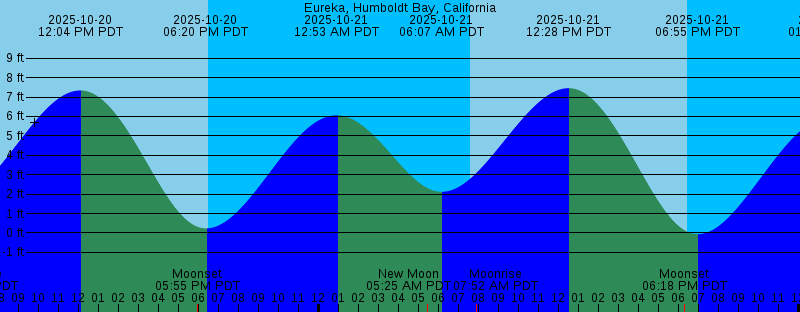 2025-10-20 06:50 AM PDT Moonrise 2025-10-20 07:33 AM PDT Sunrise 2025-10-20 12:04 PM PDT 7.34 feet High Tide 2025-10-20 05:55 PM PDT Moonset 2025-10-20 06:20 PM PDT 0.23 feet Low Tide 2025-10-20 06:28 PM PDT Sunset 2025-10-21 12:53 AM PDT 6.06 feet High Tide 2025-10-21 05:25 AM PDT New Moon 2025-10-21 06:07 AM PDT 2.12 feet Low Tide 2025-10-21 07:35 AM PDT Sunrise 2025-10-21 07:52 AM PDT Moonrise 2025-10-21 12:28 PM PDT 7.46 feet High Tide 2025-10-21 06:18 PM PDT Moonset 2025-10-21 06:26 PM PDT Sunset 2025-10-21 06:55 PM PDT -0.06 feet Low Tide 2025-10-22 01:36 AM PDT 5.96 feet High Tide 2025-10-22 06:37 AM PDT 2.58 feet Low Tide 2025-10-22 07:36 AM PDT Sunrise 2025-10-22 08:55 AM PDT Moonrise 2025-10-22 12:53 PM PDT 7.49 feet High Tide 2025-10-22 06:25 PM PDT Sunset 2025-10-22 06:43 PM PDT Moonset 2025-10-22 07:30 PM PDT -0.22 feet Low Tide 2025-10-23 02:18 AM PDT 5.84 feet High Tide 2025-10-23 07:07 AM PDT 3.02 feet Low Tide 2025-10-23 07:37 AM PDT Sunrise 2025-10-23 09:58 AM PDT Moonrise 2025-10-23 01:19 PM PDT 7.44 feet High Tide 2025-10-23 06:23 PM PDT Sunset 2025-10-23 07:14 PM PDT Moonset 2025-10-23 08:05 PM PDT -0.24 feet Low Tide 2025-10-24 03:01 AM PDT 5.67 feet High Tide |
